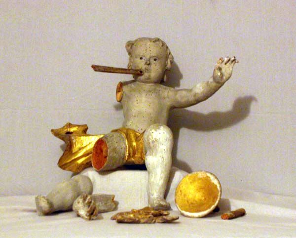 Der Engel nach der Holztränkung mit Kunstharz: im Bad lösten sich alle älteren Verleimungen auf Basis von PVAC