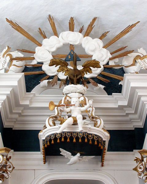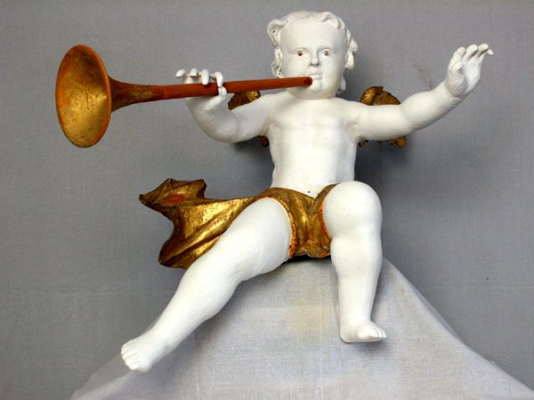Detail Schalldeckel vor den Maßnahmen. Der Engel zeigt schwere Anobienschäden