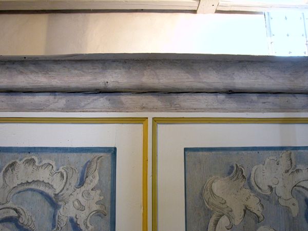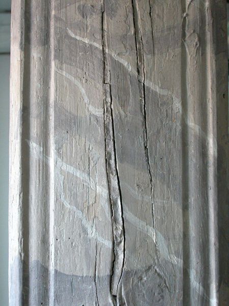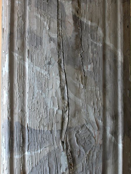 Ausschnitt Marmorierung auf einem Pfosten, Vorzustand mit ablösender Malschicht