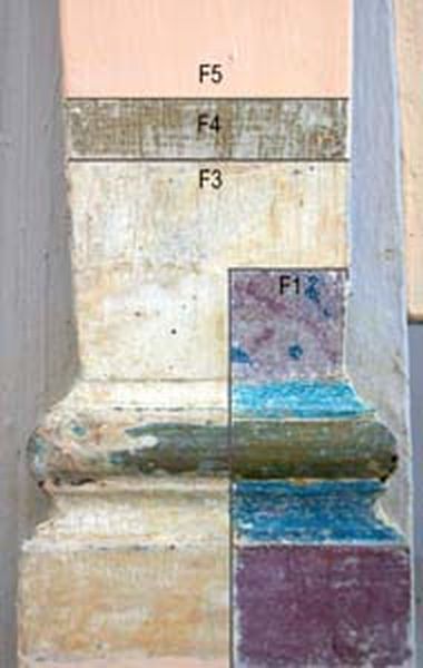 Detail aus der nebenstehenden Abbildung, Untersuchungs-stratigraphie mit Bezeichnung der einzelnen Fassungen.